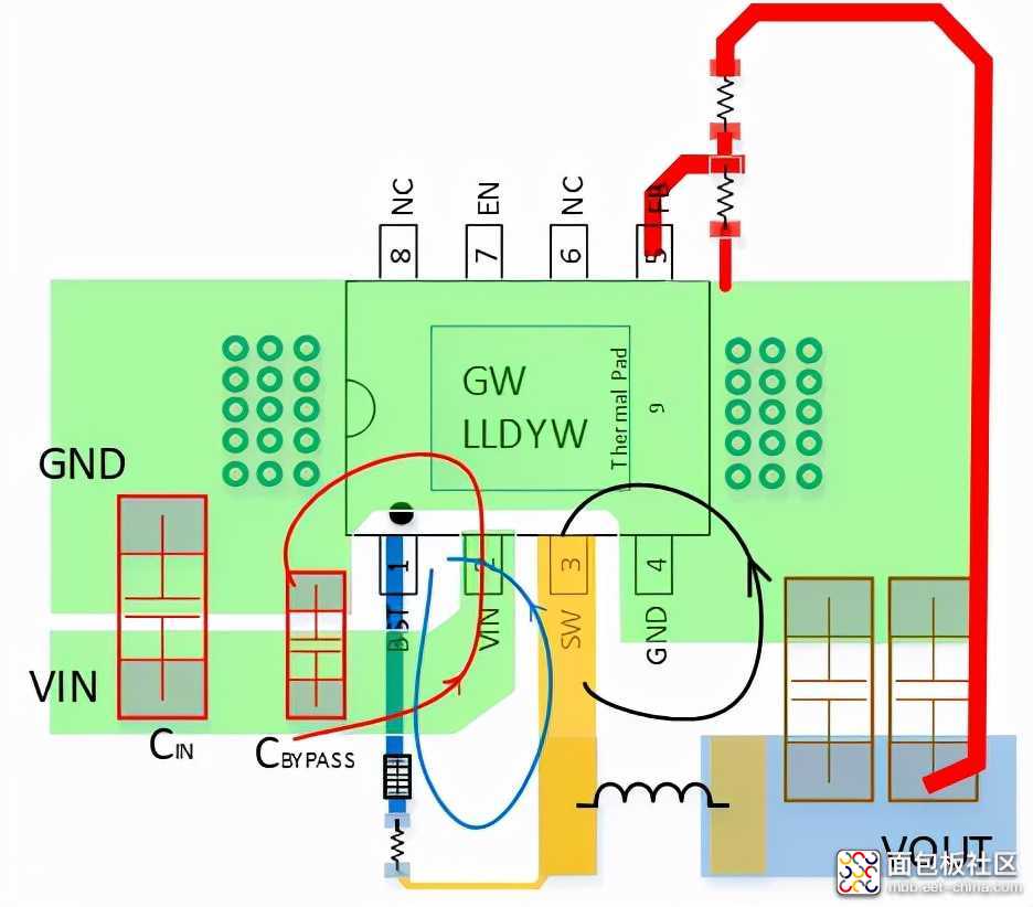 (注意:當(dāng)芯片引腳設(shè)置不足以讓我們同時(shí)兼顧輸入環(huán)路與輸出環(huán)路最小時(shí),對(duì)于BUCK而言,應(yīng)優(yōu)先考慮輸入部分回路布線最優(yōu)化。因?yàn)檩敵龌芈分须娏魇沁B續(xù)的,而輸入回路中電流是跳變的,會(huì)產(chǎn)生較大的di/dt,會(huì)引起EMI問(wèn)題的可能性更高。如果是BOOST芯片,則應(yīng)優(yōu)先考慮輸出回路布線最優(yōu)化。)