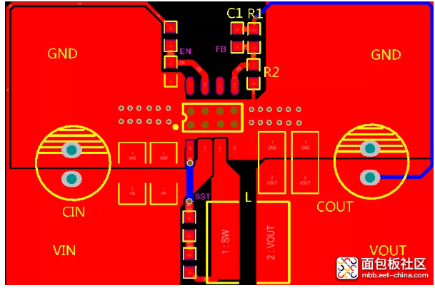 - FB的分壓電阻要從VOUT上進(jìn)行采樣,采樣點(diǎn)要靠近輸出電容處才能獲得更準(zhǔn)確的實(shí)際輸出電壓值