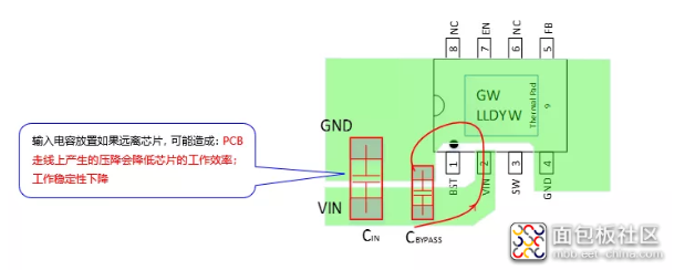 - 對(duì)于BUCK芯片而言,要想使輸入環(huán)路盡可能小,輸入電容應(yīng)盡可能靠近芯片引腳放置