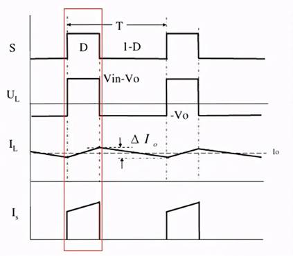 當(dāng)開關(guān)導(dǎo)通時(shí):輸入電壓Vin加到LC濾波器的輸入端,電感上的電流以固定斜率線性上升。如下圖