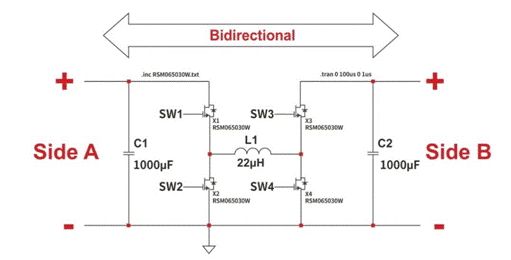 圖一顯示了簡單但功能齊全的電氣圖,其對稱配置可讓用戶選擇四種不同的工作模式。它由四個級聯(lián)降壓-升壓轉換器的單相象限組成,包括四個開關、一個電感器和兩個電容器。根據(jù)不同電子開關的功能,電路可以降低或升高輸入電壓。開關元件由碳化硅MOSFET RSM065030W組成,當然也可以用其它器件代替。