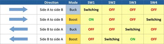 用戶可以簡單配置四個MOSFET來決定電路的工作模式,具體包括如下四種: