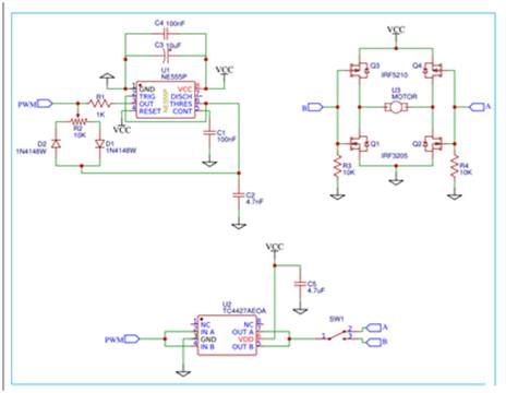 這是控制電機(jī)的電路的工作部分。MOSFET 柵極通常被下拉電阻拉低。這導(dǎo)致兩個(gè) P 溝道 MOSFET 都打開,但這不是問(wèn)題,因?yàn)闆](méi)有電流可以流動(dòng)。當(dāng) PWM 信號(hào)加到一條腿的柵極時(shí),N 和 P 溝道 MOSFET 交替開啟和關(guān)閉,從而控制功率。