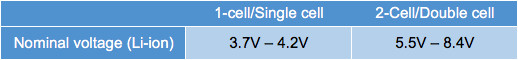 移動(dòng)電源普遍使用鋰離子電池,因?yàn)槠涔β拭芏雀摺⒅亓枯p、自放電率低、維護(hù)成本低。表 1 顯示了 1 節(jié)和 2 節(jié)配置中鋰電池的額定電壓。通常,對(duì)于移動(dòng)電源應(yīng)用,建議使用 2 芯配置,因?yàn)樾矢摺?/font>