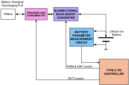 圖 3 顯示了典型 USB Type-C 移動(dòng)電源的框圖。Type-C 移動(dòng)電源具有單個(gè) Type-C 連接器接口,用于對(duì)鋰離子電池進(jìn)行充電和放電。Type-C PD 控制器是移動(dòng)電源的核心,負(fù)責(zé)管理控制鋰離子電池充電和放電的升降壓穩(wěn)壓器。