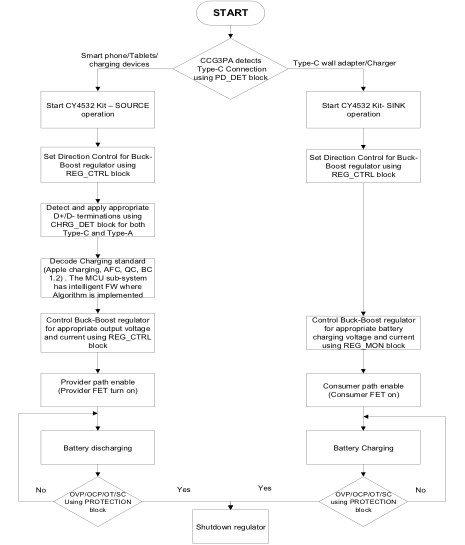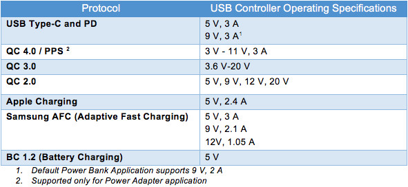 如今,可以使用專為滿足移動(dòng)電源和電源適配器應(yīng)用要求而設(shè)計(jì)的 Type-C 控制器。例如,賽普拉斯半導(dǎo)體的 EZ-PD CCG3PA 控制器支持具有可編程電源 (PPS) 模式的 USB PD 3.0 規(guī)范。該控制器還支持傳統(tǒng)的 BC1.2 和各種專有充電方法,如高通快速充電(QC)、三星自適應(yīng)快速充電 (AFC) 和 Apple 充電。