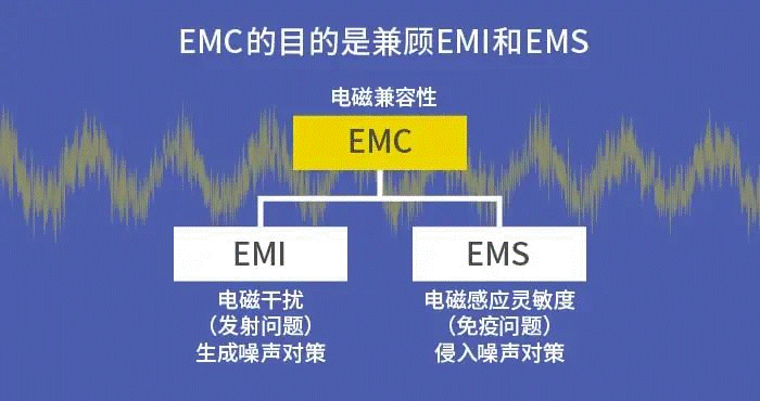 因此電子設備就同時需要具備防止自身產(chǎn)生噪聲的EMI (電磁干擾:Electro Magnetic Interference) 對策和防止自身受到影響的EMS (電磁敏感性: Electro Magnetic Susceptibility) 對策。這就叫做EMC (Electromagnetic Compatibility),即電磁兼容性。簡單來說,就是需要同時采取措施應對Emission (發(fā)射) 問題和Immunity (免疫) 問題,即應對生成噪聲和侵入噪聲,兼顧兩方面的方案就叫做EMC。