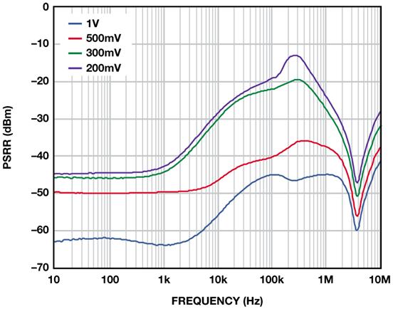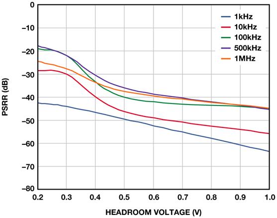 在低裕量工作模式下,需要考慮裕量電壓對PSRR的影響,否則,會(huì)導(dǎo)致輸出電壓噪聲水平高于預(yù)期。如圖3 所示的PSRR與裕量電壓關(guān)系曲線通?稍跀(shù)據(jù)手冊中找到,而且可以用來確定給定條件下可以實(shí)現(xiàn)的噪聲抑制量。