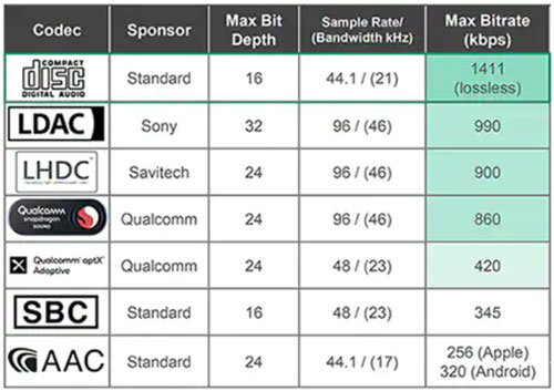 表 1:“無損”編解碼器(Sony、Savitech 和 Qualcomm)與 CD 質(zhì)量和有損編解碼器(Qualcomm 和藍牙技術(shù)聯(lián)盟 (SBC))的比較。請注意,無損編解碼器的最大比特率受限于藍牙無線鏈路的能力。(圖片來源:Knowles)