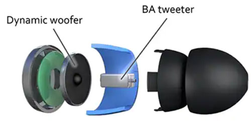 解決辦法是將低音和高音頻率分給一個動態(tài)低音單元和一個獨立的平衡電樞 (BA) 高音單元。BA 高音單元是一種專用組件,最初是為助聽器應(yīng)用而開發(fā)的,現(xiàn)在越來越多地被用于提升高品質(zhì)耳塞的高音響應(yīng)。在 BA 高音單元中,電子信號會振動一個微小的簧片,平衡緊湊外殼內(nèi)的兩個磁鐵;善倪\動被轉(zhuǎn)移到一個非常堅硬的鋁制振膜上,從而產(chǎn)生聲音。