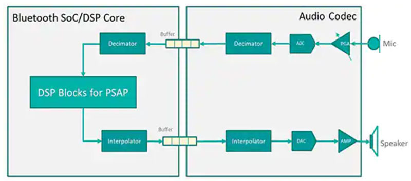 一個典型的音頻 PSAP 系統(tǒng)包括一個音頻編解碼器和 DSP 核心。這個 PSAP 音頻系統(tǒng)有一個音頻編解碼器和一個連接模數(shù)轉(zhuǎn)換器 (ADC) 的麥克風(fēng)輸入簡化視圖。音頻編解碼器對 ADC 的數(shù)字輸出進(jìn)行解碼,為向藍(lán)牙片上系統(tǒng) (SoC)/DSP 內(nèi)核進(jìn)行數(shù)字傳輸做準(zhǔn)備(圖 2)。