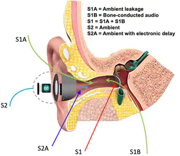這個激活的 PSAP 有兩種類型聲音到達(dá)用戶的耳膜。S1 是殘留的用戶語音環(huán)境泄漏 (S1A) 和骨傳導(dǎo) (S1B) 聲音的疊加。對于 S1 來說,耳穿戴設(shè)備遮住了耳朵的開口,以阻止聲音到達(dá)內(nèi)部和逃出耳道之外(圖 3)。