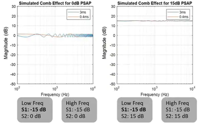 圖 4 中的變量有延遲和增益 (G)。S1 信號直接進(jìn)入耳膜。通過將環(huán)境中的 S1 聲音添加到電子 S2 路徑中,S2 中的增益功能就會產(chǎn)生一個延遲。S1 和 S2 的加入有可能產(chǎn)生回聲,但這可以通過操縱延遲時間和增益大小來減少。