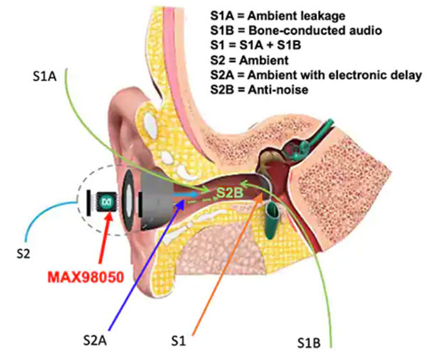 圖 3:PSAP 中到達(dá)耳膜的三個聲源:環(huán)境泄漏 (S1A)、骨傳導(dǎo) (S1B) 和經(jīng)過處理的環(huán)境聲 (S2A)。(圖片來源:Maxim Integrated,由 Bonnie Baker 修改)