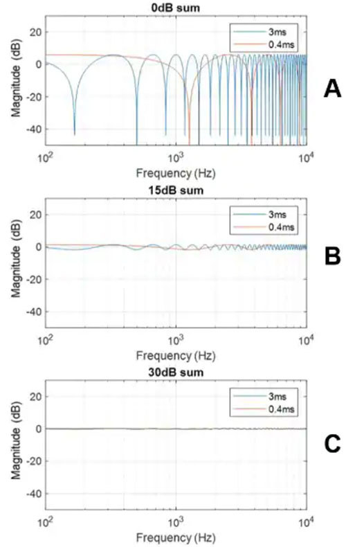 圖 5:基于信號模型的兩個聲音的疊加頻率響應(yīng),延遲變化從 0.4 ms 到 3 ms,增益變化為 0dB、15dB 和 30dB。(圖片來源:Maxim Integrated,由 Bonnie Baker 修改)