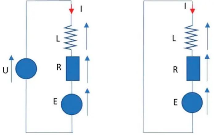 直流電機的特點是電感L、電阻R 和反電動勢E 串聯(lián)。反電動勢是由磁感應(yīng)(法拉第- 楞次感應(yīng)定律)產(chǎn)生的電壓,它與施加的電壓相反,并且與電機速度成正比。圖8 顯示了PWM 接通和PWM 斷開時的電機。