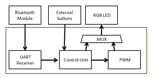 GreenPAK IC將是該項目的控制核心:它從藍牙模塊和/或外部按鈕接收數(shù)據(jù),然后開始所需的程序來顯示正確的照明。它還生成PWM信號并將其輸出到LED。下面的圖1展示了功能框圖。