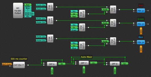 如果禁用手動模式并開啟自動混合模式,則顏色每500毫秒改變一次,上升沿來自CNT7。4-bit LUT1 用于防止D0 D1 D2處于“000”狀態(tài),因為該狀態(tài)會導(dǎo)致燈在自動混合模式時關(guān)閉。