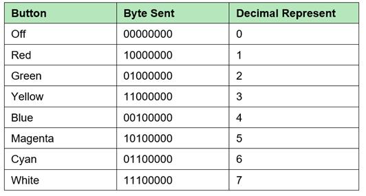 前三個bit:B0、B1和B2將通過預(yù)定義顏色的按鈕在直接控制模式下保持RGB LED的狀態(tài)。因此,當單擊其中任意一個按鈕時,將發(fā)送該按鈕的相應(yīng)值,如表2所示。