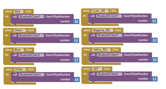 在本節(jié)中,我們將創(chuàng)建一個安卓應(yīng)用程序,它將監(jiān)測和顯示用戶的控件選擇。界面由兩部分組成:第一部分包含一組具有預(yù)定義顏色的按鈕,因此當按下這些按鈕中的任意一個時,相應(yīng)顏色的LED會亮起。第二部分(MIX方塊)為用戶創(chuàng)建混合顏色。