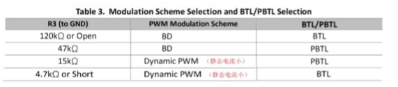 3. pin14 AD52090 pin14(PBTL)用來(lái)設(shè)置雙聲道(BTL)以及單聲道(PBTL)工作模式。 低電平:雙聲道(BTL); 高電平:?jiǎn)温暤溃≒BTL) ACM3128A pin14(MODS/PBTL)用來(lái)設(shè)置調(diào)制模式以及雙聲道(BTL)以及單聲道(PBTL)工 作模式。接一個(gè)電阻到地,不同電阻對(duì)應(yīng)四個(gè)模式。