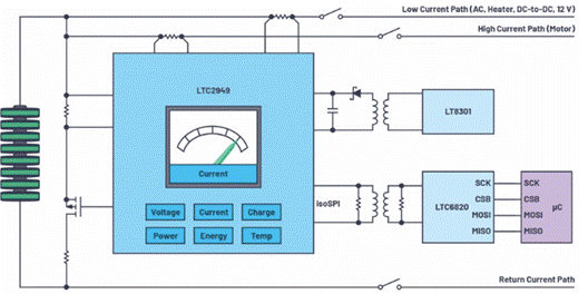 EV電池組監(jiān)視器是專為EV設(shè)計(jì)的高精度電流、電壓、溫度、電荷、功率和電能表。通過測量這些關(guān)鍵參數(shù),系統(tǒng)設(shè)計(jì)人員具備了計(jì)算整個(gè)電池組的實(shí)時(shí)SOC和SOH以及其他品質(zhì)因數(shù)的基本要素。圖 2 示出了用于高端電流檢測配置的 LTC2949 的框圖。其中,LTC2949采用可調(diào)浮動拓?fù),使其能夠監(jiān)控非常高電壓的電池組,不受其自身14.5 V額定電壓的限制。LTC2949 的電源通過一個(gè)具有 V 的LT8301隔離式反激式轉(zhuǎn)換器提供抄送連接到電池正極。