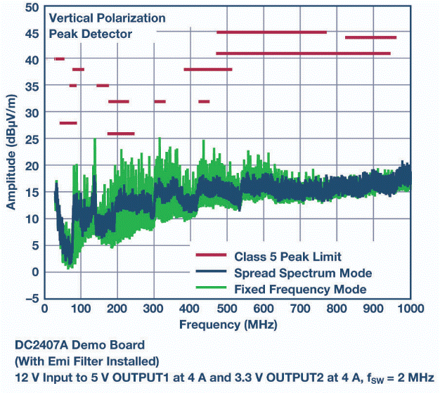 有關(guān)排放輸出特性,請(qǐng)參見圖4。這種改進(jìn)的EMI/EMC性能對(duì)電路板布局不敏感,即使在使用2層PC板時(shí)也能簡(jiǎn)化設(shè)計(jì)并降低風(fēng)險(xiǎn)。LT8645S可在整個(gè)負(fù)載范圍內(nèi)輕松通過汽車CISPR 25,5類峰值EMI限制。擴(kuò)頻頻率調(diào)制也可用于進(jìn)一步降低EMI水平。