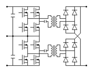 帶有次級(jí)同步整流拓?fù)浣Y(jié)構(gòu)的DAB-ZVT轉(zhuǎn)換器也非常典型。這些都是用PWM工作,一般來(lái)說(shuō),需要比LLC轉(zhuǎn)換器更簡(jiǎn)單的控制。DAB可以被認(rèn)為是傳統(tǒng)的全橋移相ZVT轉(zhuǎn)換器的演變,但漏電感器在初級(jí)端,這簡(jiǎn)化了繁瑣的次級(jí)端整流,減少了二次開(kāi)關(guān)或二極管的必要額定擊穿電壓。由于實(shí)現(xiàn)了ZVT,這些轉(zhuǎn)換器可以在很寬的輸出電壓范圍內(nèi)提供穩(wěn)定的高能效。這對(duì)于支持800 V和400 V電池電壓水平的充電器來(lái)說(shuō)是個(gè)方便的因素。DAB的PWM工作帶來(lái)了好處。首先,它傾向于使轉(zhuǎn)換器的電磁干擾(EMI)頻譜比調(diào)頻系統(tǒng)中的更緊密。此外,用固定的開(kāi)關(guān)頻率,系統(tǒng)在低負(fù)載時(shí)的行為更容易解決。通過(guò)同步整流,DAB是一種雙向的原生拓?fù)浣Y(jié)構(gòu),是快速電動(dòng)汽車充電器的最通用的替代方案和合適的解決方案之一。