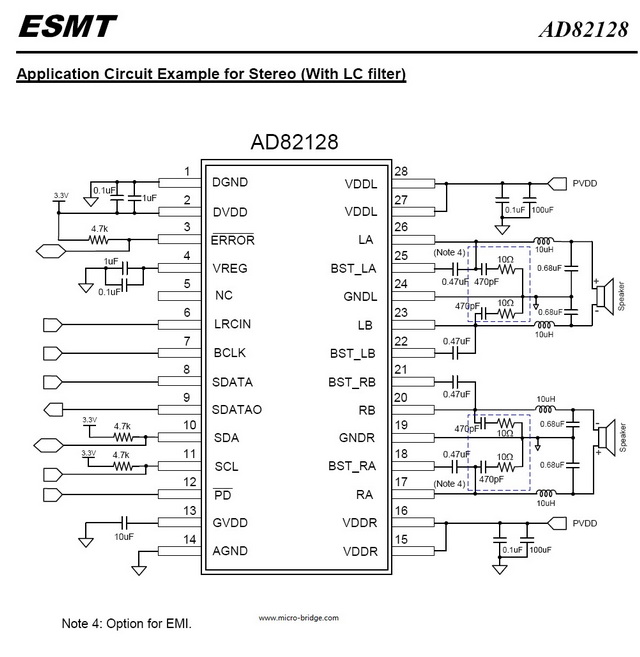 AD82128 is a digital audio amplifier capable of driving 25W (BTL) each to a pair of 8Ω load speaker and 50W (PBTL) to a 4Ω load speaker operating at 24V supply without external heat-sink or fan requirement with play music. AD82128 provides advanced audio processing functions, such as volume control, 32 EQ bands, audio mixing, 3D surround sound and Dynamic Range Control (DRC). These are fully programmable via a simple I2C control interface. Robust protection circuits are provided to protect AD82128 from damage due to accidental erroneous operating condition. The full digital circuit design of AD82128 is more tolerant to noise and PVT (Process, Voltage, and Temperature) variation than the analog class-AB or class-D audio amplifier counterpart implemented by analog circuit design. AD82128 is pop free during instantaneous power on/off or mute/shut down switching because of its robust built-in anti-pop circuit.