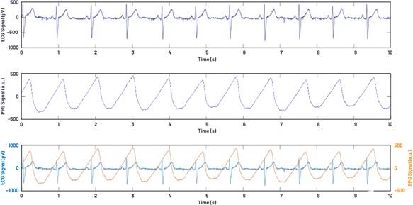集成了時間戳功能,以支持來自多個連接傳感器的數(shù)據(jù)樣本之間的同步。一旦使用多個傳感器數(shù)據(jù)來查找各種測量結(jié)果之間的相關(guān)性,就需要這樣做。圖2顯示了如何使用該芯片測量與光電容積脈搏波(PPG)測量同步的ECG;诿}沖傳輸時間(PPT)測量技術(shù),可以在連續(xù)模式下測量血壓。這對高血壓患者非常有吸引力。時間戳功能使這成為可能。
