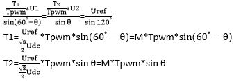 圖4為參考電壓在第一扇區(qū),有兩個非零矢量U1U2和零矢量合成,當參考電壓進入下一個扇區(qū),采用新的相鄰兩個矢量與零矢量進行合成;谑噶亢铣梢(guī)則,在符合T1+T2 《= Tpwm條件下,并要求任意角度下V1和V2都能合成出的矢量,所以Uref_max=√3/2 Udc。調(diào)制度M=Uref/(Uref_max)=Uref/(√3/2 Udc)。