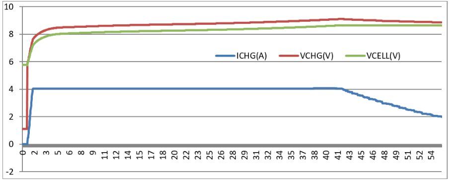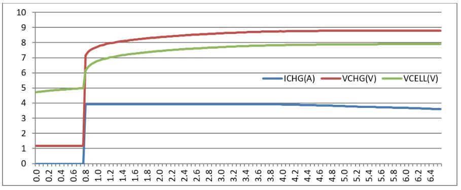 基于這個(gè)管理過程,使用充電芯片BQ24725A對一塊對講機(jī)電池(滿充電壓8.8V)進(jìn)行充電,并記錄下充電過程中的VCHG, ICHG和VCELL(電芯側(cè)的電壓)。下圖所示為基于橫坐標(biāo)的充電時(shí)間(分鐘)對應(yīng)的各個(gè)參數(shù)的變化趨勢,可以看到在不到第五分鐘,VCHG就達(dá)到最大值,ICHG就從峰值的4A電流開始下降,經(jīng)歷了從CC區(qū)間到CV區(qū)間的切換。最大充電速率的CC階段4A充電持續(xù)時(shí)間很短,可以預(yù)料,如果要對這塊電池完全充滿,CV區(qū)間將耗費(fèi)很長的時(shí)間。