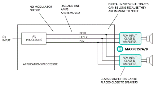由于其高效率和出色的EMI性能,無濾波器數(shù)字輸入D類放大器已成為消費(fèi)電子設(shè)備中驅(qū)動(dòng)揚(yáng)聲器的公認(rèn)標(biāo)準(zhǔn)。這是因?yàn)樗鼈儾皇芘c模擬對(duì)應(yīng)物相關(guān)的電路板設(shè)計(jì)問題的影響,最具體地說是信號(hào)完整性。單通道數(shù)字D類放大器可以放置在電路板上的遠(yuǎn)程位置,以最大限度地減少大電流電池和揚(yáng)聲器負(fù)載連接的布線。這些放大器不需要模擬輸入D類設(shè)計(jì)所需的DAC和線路驅(qū)動(dòng)器。因此,空間和系統(tǒng)成本下降,設(shè)計(jì)變得更加簡(jiǎn)單。許多D類放大器接受脈沖編碼調(diào)制(PCM)或I類放大器2需要三根導(dǎo)線的 S 數(shù)據(jù):BCLK、LRCLK 和 DIN(圖 2)。PCM 數(shù)據(jù)格式不需要調(diào)制器或應(yīng)用處理器上數(shù)據(jù)的上采樣來提供立體聲數(shù)據(jù)。