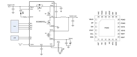SC89601D采用QFN 4X4-24 封裝,輸入支持高達22V 耐壓。芯片集成了反向阻斷管(RBFET),降壓功率管(HSFET及LSFET),功率路徑管理管(BATFET),功率管驅(qū)動供電和電路,大幅度簡化了系統(tǒng)設(shè)計。MCU可通過I2C 接口靈活配置充電參數(shù),SC89601D支持3A充電電流,及1.2A 反向OTG 電流。