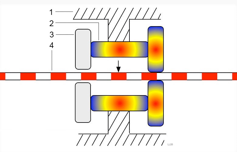 圖 3 壓電電機可以像尺蠖一樣以微小的增量向前爬行,在通電和斷電方面有適當?shù)膴A緊和松開時機(1:外殼,2:移動晶體,3:鎖定晶體,4:旋轉(zhuǎn)部分) . 資料:維基百科用戶LaurensvanLieshout