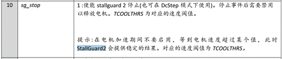 當(dāng)電機(jī)堵轉(zhuǎn)時(shí),SG_RESULT變?yōu)?,可配置斜坡發(fā)生器 SW_MODE中的sg_stop 使能在堵轉(zhuǎn)事件時(shí)停止電機(jī)。將TCOOLTHRS設(shè)置為與較低的速度閾值相匹配,在該閾值下,StallGuard2 結(jié)果最佳,完成有效的sg_stop。