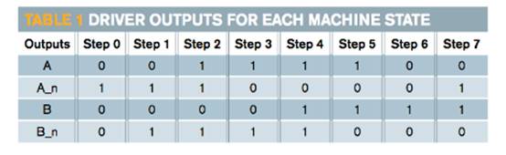 CPLD的輸出包括A相和A_n相以及B相和B_n相,每個相位通過外部電源驅動器IC控制電機的兩個線圈之一2 和集成電路3 ,在電機的標稱電壓(圖1 ).每個驅動器輸出端的一對肖特基二極管在通過反轉繞組電流引起的感性電壓瞬變期間保護驅動器的輸出。將 MOSFET 驅動器與內(nèi)部二極管配合使用,例如 微芯片的 TC4424A 雙驅動器,可省去對外部二極管的要求。