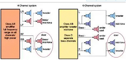 添加兩個(gè)通道可以解決幾個(gè)問題。首先,它允許大功率低音揚(yáng)聲器通過兩個(gè)新通道獨(dú)立驅(qū)動(dòng)至汽車前排座椅下方的揚(yáng)聲器。消除門共振。更高的聲音保真度也是可能的,因?yàn)樗械膿P(yáng)聲器都沒有義務(wù)在整個(gè)頻率范圍內(nèi)工作。