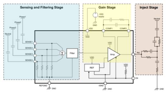 TI的獨(dú)立式有源EMI濾波器IC的工作原理為,先檢測共模噪聲,然后通過內(nèi)部運(yùn)放輸出反向并放大的信號,然后將其注入到線路中,相當(dāng)于放大了Y電容的等效電容,從而抵消原有的共模噪聲。Roja de Cande表示:“這既能夠有效減小漏電流,同時也能夠放大 100kHz 至 3MHz 的等效 Y 電容,進(jìn)一步降低整個共模電感的感量,從而降低方案的體積和重量。”
