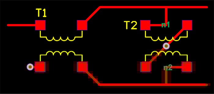 圖 5 顯示了該電路的另一種布局。在這種情況下,連接 T1 和 T2 的走線運(yùn)行到中點(diǎn)(上路徑為 n1,下路徑為 n2),然后連接到 T2 的相應(yīng)焊盤。這使得兩條路徑相同。此外,請注意對稱走線用于 T2 的兩個(gè)接地焊盤。