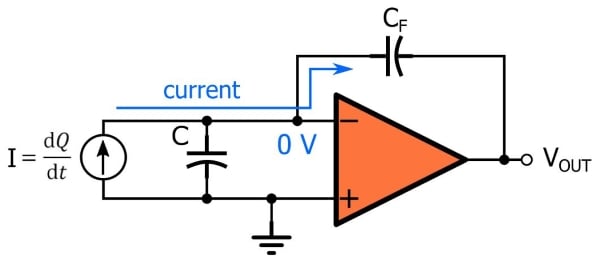 如果傳感器的電流流向運(yùn)算放大器的反相輸入端,則電荷放大器會(huì)產(chǎn)生負(fù)電壓。如果我們回想一下流入運(yùn)算放大器的電流量很小并且反相端子處于虛地,我們就會(huì)明白為什么會(huì)這樣:傳感器電流的路徑是圍繞運(yùn)算放大器并通過反饋路徑,并且對(duì)于電流從反相端(0 V)流向輸出端,輸出電壓必須為負(fù)。