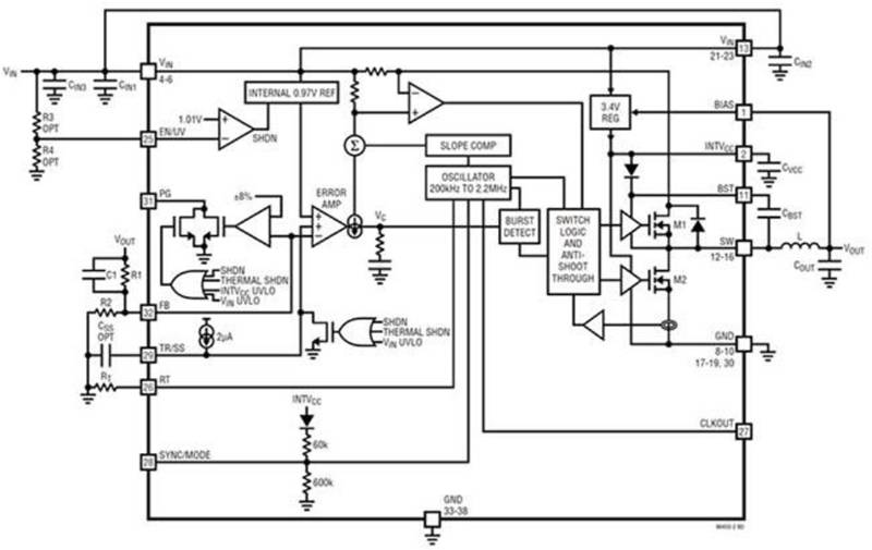 圖 1:Silent Switcher 降壓穩(wěn)壓器的方框圖展示了它們的復(fù)雜度,但無法顯示用于實現(xiàn)重大性能改進的技術(shù)細節(jié)。(圖片來源:Analog Devices)