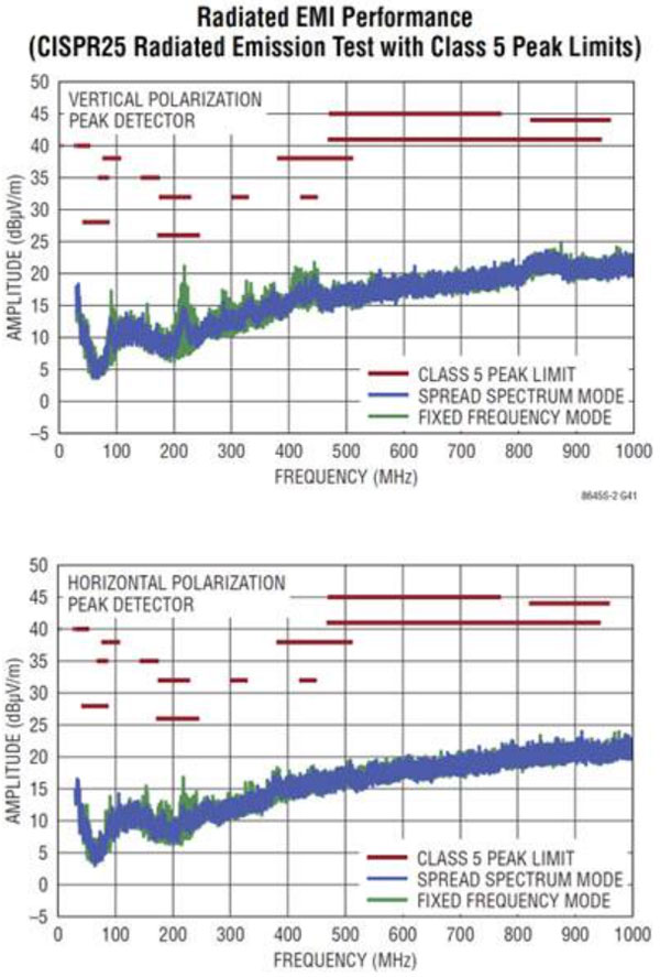 為了抑制熱回路,Silent Switcher 設(shè)計將熱回路分為兩個均衡回路,使得它們的電流可以有效地相互抵消。為了解決走線電感問題,在芯片上集成旁路電容器,避免與印刷電路板走線電感和瞬時振蕩有關(guān)的問題,同時通過消除外部元器件及其貼裝的可變性確保性能。這種做法讓輻射放射性能能夠輕松達到 CISPR 25 標(biāo)準(zhǔn)限值(圖 3)。