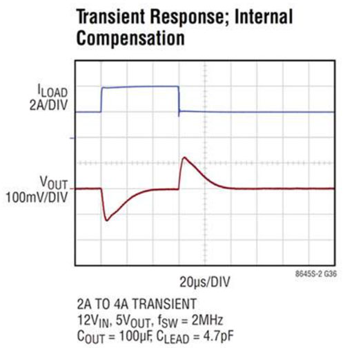 這些開關(guān)穩(wěn)壓器的設(shè)計還能夠改進瞬態(tài)響應(yīng)。它們提供清晰、精密的調(diào)節(jié)(盡管負載變化),并可在各種不同工作條件下保持回路穩(wěn)定性(圖 4)。為了增加靈活性,LT8646S 器件還允許外部電阻-電容器 (RC) 補償,讓設(shè)計人員能夠優(yōu)化瞬態(tài)響應(yīng)。