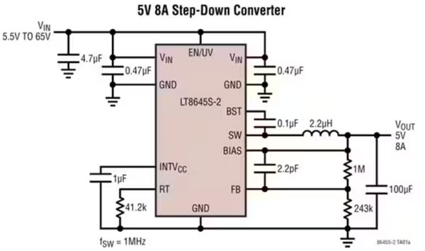 但是,隨著最近的技術(shù)進步和創(chuàng)新拓撲結(jié)構(gòu)的問世,這種情況已經(jīng)改變,LT8645S、LT8646S 和 LT8645S-2 就證明了這一點。這三款相似的 65 V 單片 Silent Switcher 同步降壓穩(wěn)壓器來自于 Analog Devices,每款穩(wěn)壓器都能夠支持 8 A 輸出(圖 1)。