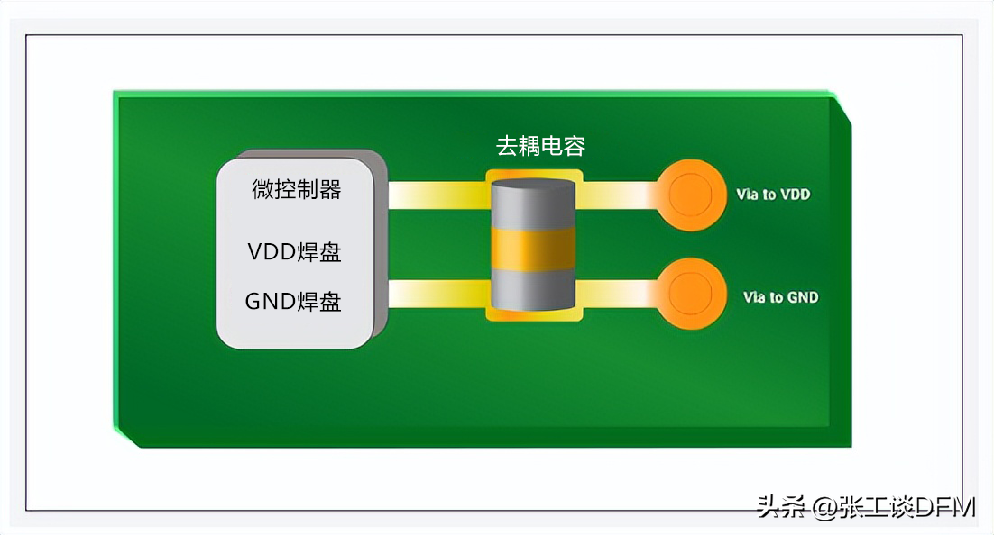 當(dāng) IC 工作時(shí),由于其內(nèi)部結(jié)構(gòu),它們會以高頻進(jìn)行切換。這種情況會在 IC 連接軌道中產(chǎn)生開關(guān)噪聲。如果不控制這種噪聲,它將導(dǎo)致發(fā)射,從而導(dǎo)致 EMI 。通過在 IC 附近放置一個(gè)去耦電容,可以減少 PCB 上開關(guān)噪聲的傳播并將噪聲引導(dǎo)至地面。