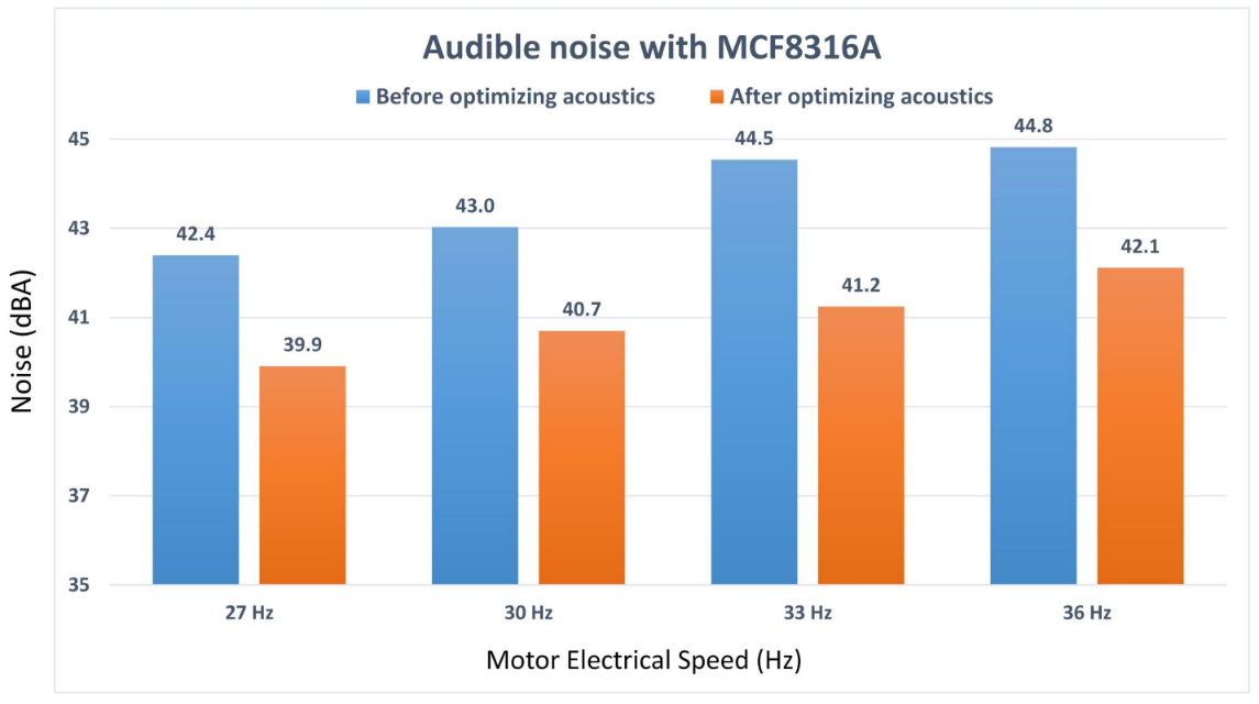 例如,TI 無傳感器 BLDC 集成梯形控制柵極驅(qū)動器(如 MCT8329 和 MCT8316)采用此內(nèi)置功能來優(yōu)化多種電機頻率下的聲學性能,如圖 9 所示。