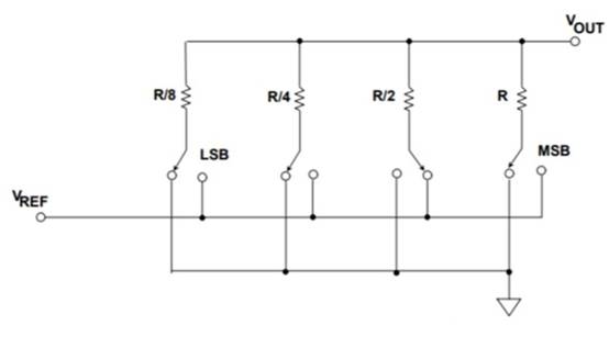 圖1.電壓模式二進(jìn)制加權(quán)電阻DAC轉(zhuǎn)換結(jié)構(gòu)