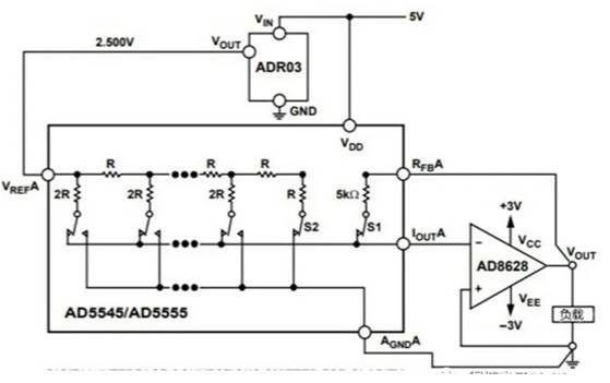 電流輸出DAC具有代碼相關(guān)的輸出阻抗,因此其輸出必須在負(fù)載之前驅(qū)動(dòng)虛擬接地運(yùn)算放大器,以保持輸出線性度。以亞德諾半導(dǎo)體(Analog Devices)的AD5545 為例