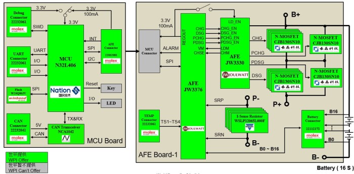 本方案采用上板+下板的結(jié)合方式。上板為MCU板,主要搭載了國(guó)民技術(shù)N32L406 MCU以及CAN、UART等接口,下板為AFE板,主要集成了杰華特JW3376和JW3330芯片以及均衡電路、充放電控制電路、溫度采集電路等模塊。
